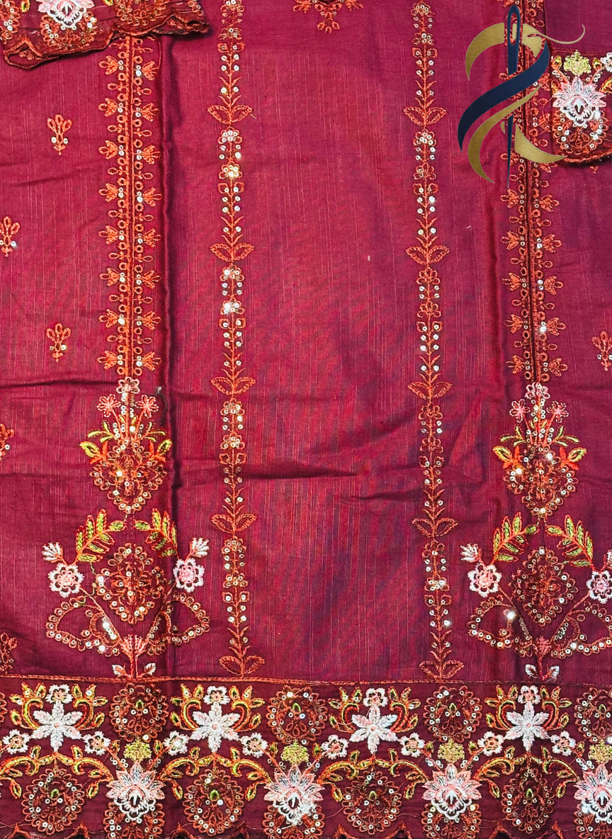 Embroidered Maroon Khadar 3-Piece Stitched Suit with Tissue Dupatta – Medium Size